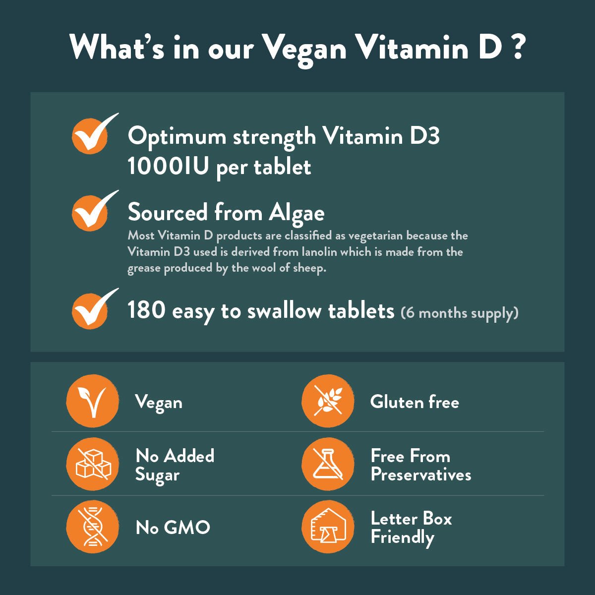 Each tablet contains 1000iu of Vitamin D3, providing 500% of your Nutrient Reference Value (NRV) for maximum health benefits.